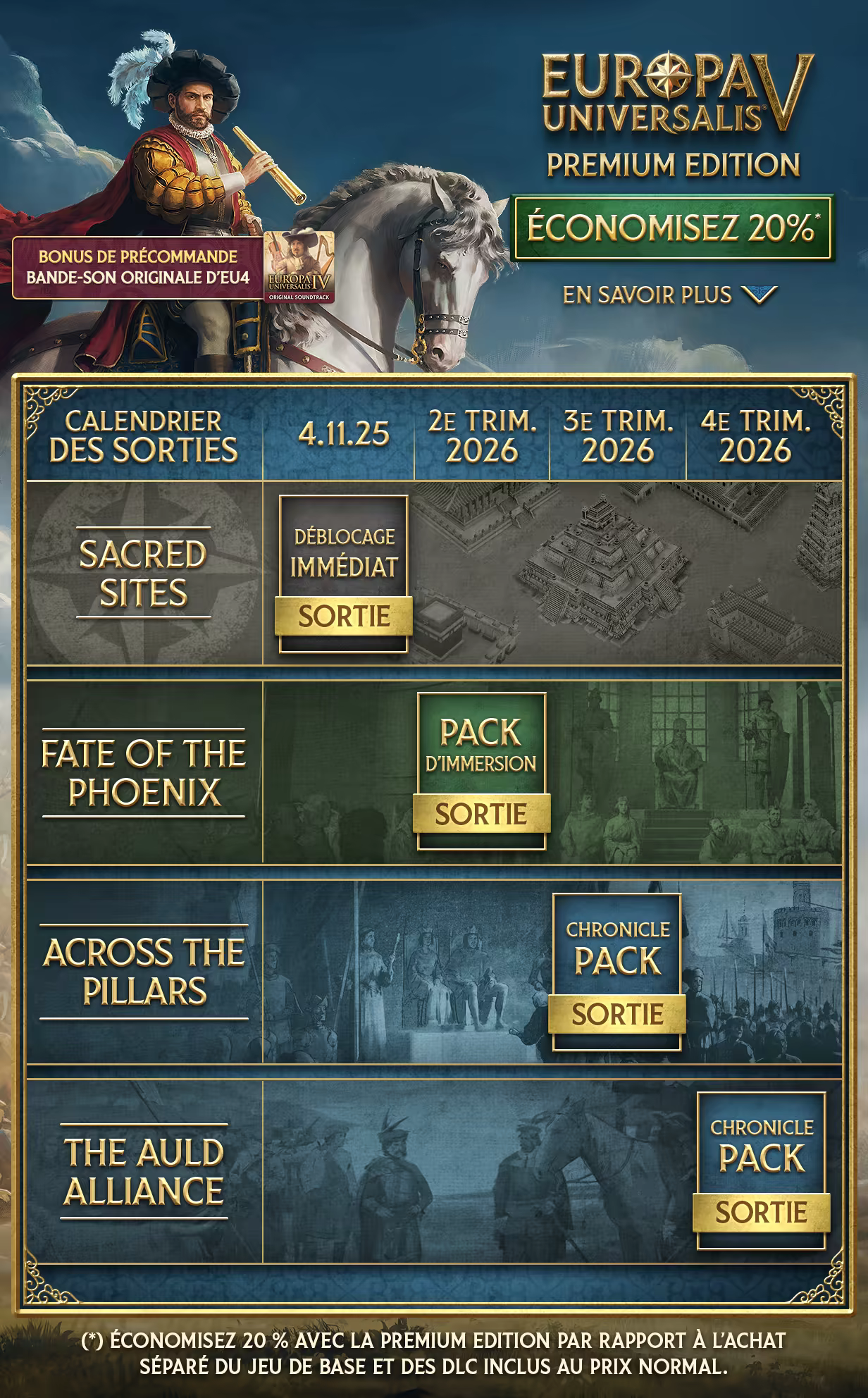 Alors vous l'aurez vu, il y a également une édition premium de proposé dans le lot donc on va décortiquer ça comme d'habitude. C'est essentiellement le premier season pass du jeu pour l'année 2026 qui contiendra 3 dlcs pour la somme de 25€ au total, on à l'habitude des tarifs Paradox donc autant vous dire tout de suite, il y n'y aura pas de dlc majeur en 2026 pour EUV, on va être sur du petit dlc régional qui vont concerner une poignée de pays.