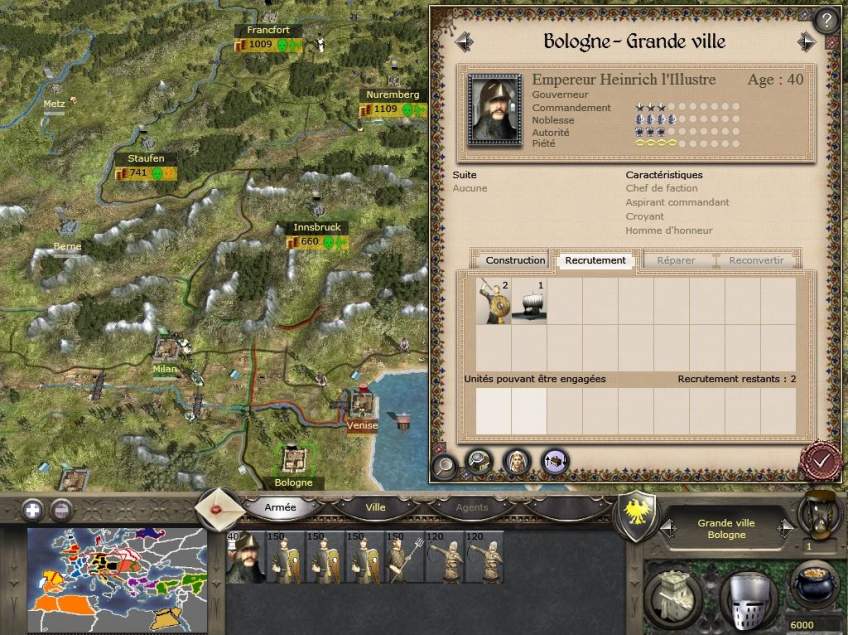 Vous avez une armée relativement équilibrée, il faut donc vous développer dans tous les domaines. Essayez surtout de développer rapidement vos troupes de combat en terrain difficile, elles vous serons utiles en début de campagne avec les alpes et le nombre de forêts. Essayez aussi d'avoir rapidement une guilde des chevaliers teutoniques, ils sont très utiles.