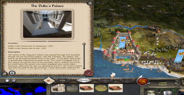 The citadel guard is the elite core of troops tasked with protecting the duke's palace, the senate and the inner city. These soldiers are equipped with the best equipment that the city's blacksmiths have to offer. They are fully clad in plate armour, wear steel helmets and use heavy shields as protection. Due to their expensive equipment and elite training the citadel guard are available in few numbers and on the battlefield they need to be covered by ranged troops and complemented by other types of infantry. The guard is the heaviest infantry available to Ragusa and should be used as a shock force and thrown in battle in key moments to tip the balance in favour of the republic.