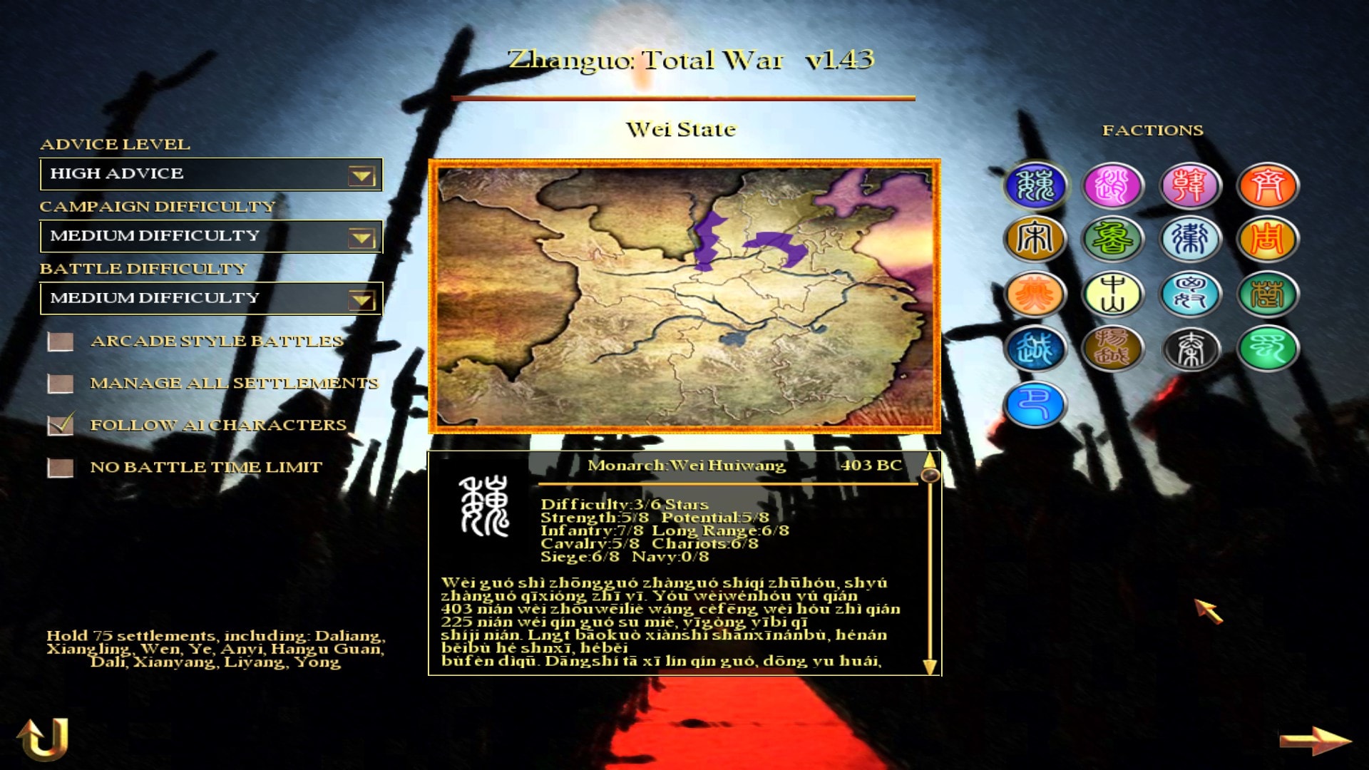 réalisé par la communauté chinoise. Il transporte le jeu durant la période des Royaumes combattants de l'Histoire de Chine, une période s'étendant d'environ le Vème siècle av. J.-C à la fin du IIème siècle av. J.-C. On retient le plus souvent la date de 475 av. J.-C pour le début de la période, jusqu'en 221 av. J.-C, date de l'unification de la Chine par la dynastie des Qin.