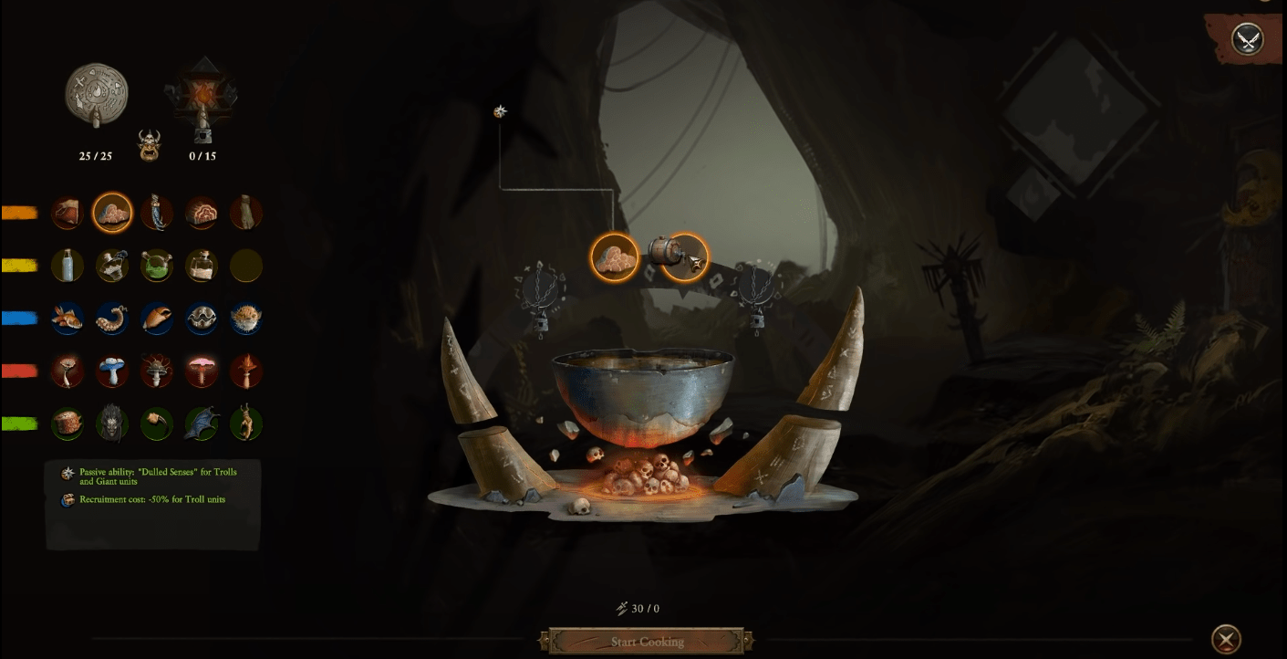 Les effets des plats sont naturellement l’addition des effets individuels des ingrédients. La bière naine, par exemple, réduit le coût de recrutement des Trolls et leur donne la capacité « Sens engourdis » qui les rend Indémoralisables. Combinée à la viande de Troll, elle crée un plat spécial, la Pizza Magnum, qui confère des bonus de statistiques à Grom, la Régénération aux gobelins de son armée et les améliorations vues précédemment aux Trolls ; le tout durant 15 tours. C’est assez puissant pour une mécanique accessible dès le premier tour !