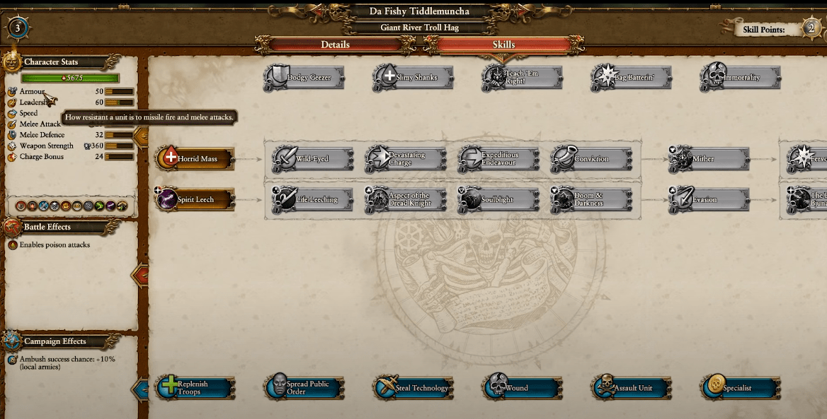 Nous avons aussi un aperçu des caractéristiques de la Sorcière Troll d’Eau géante, qui est unique en tant que monstre capable de lancer des sorts. Elle ouvre l’accès au Domaine de la Mort pour les Peaux-Vertes. Mais en tant que Troll, elle a aussi le cuir plus solide que la plupart des jeteurs de sorts, la Régénération et des capacités de défense plus élevées grâce à ses attaques empoisonnées. Elle possède aussi une attaque de souffle (enfin, de vomi) corrosif. Cela dit, attention, le moral des Trolls reste notoirement bas, et c’est une faiblesse même chez leurs héros. Son rôle, en particulier en multijoueur, risque de souffrir de cette faille.